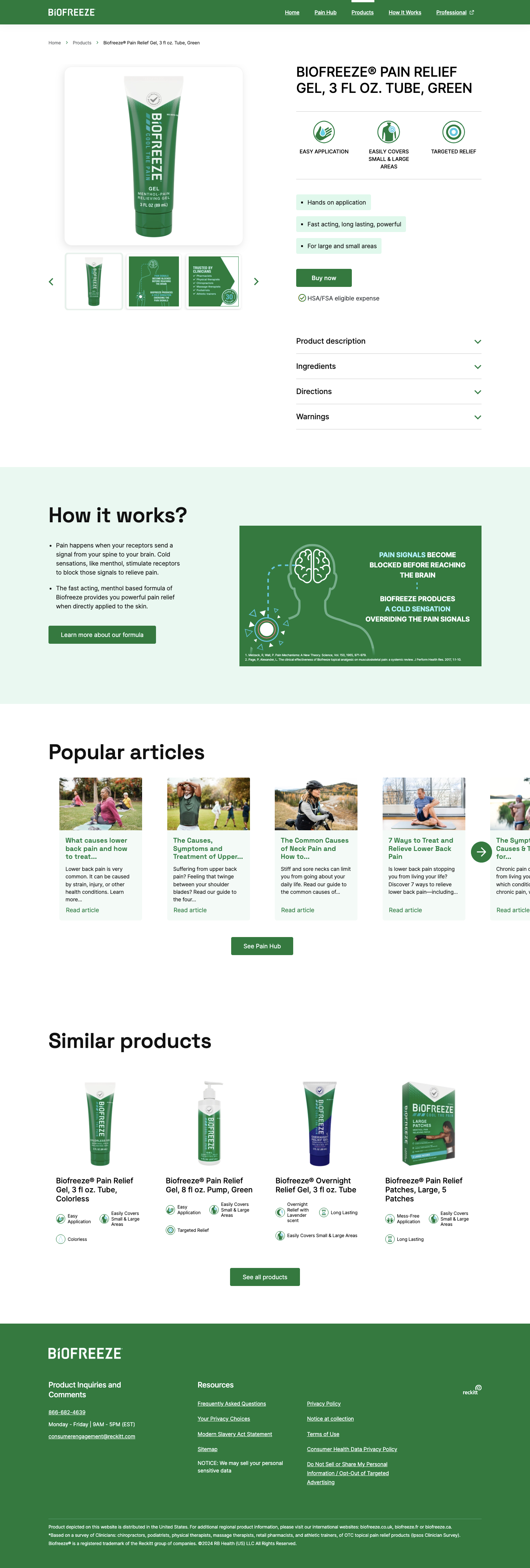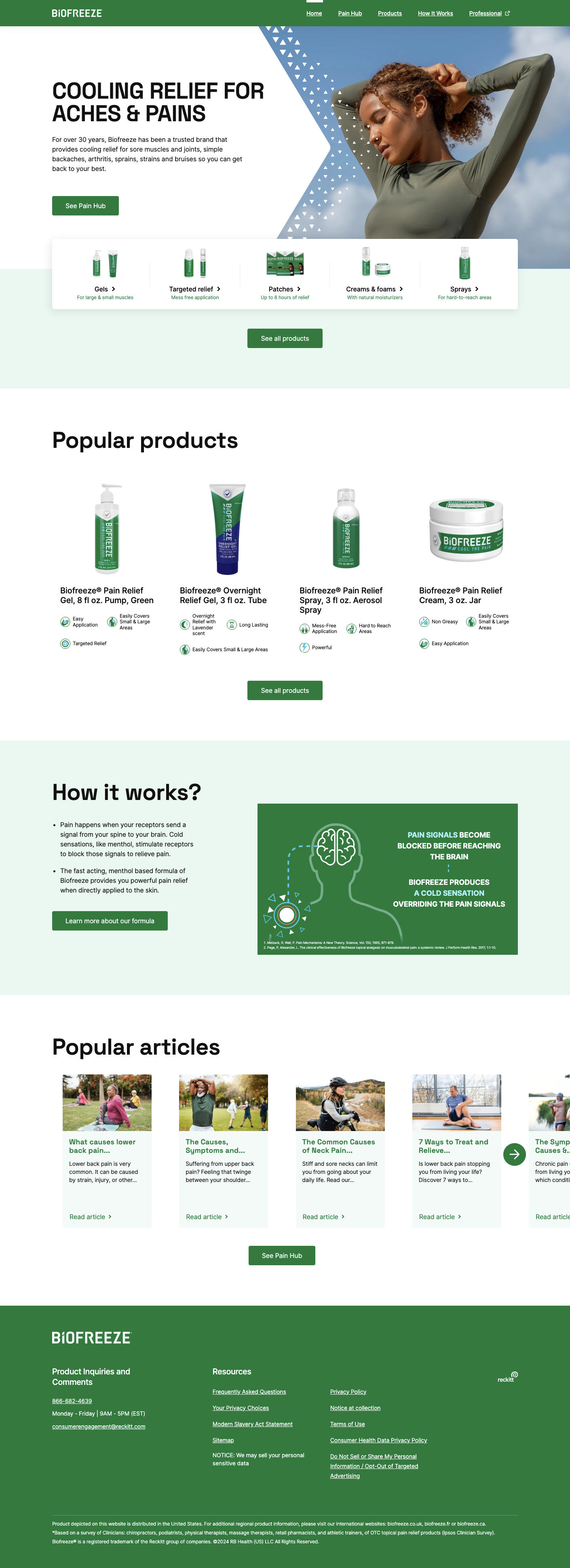 Biofreeze, a non-medicated topical product for pain relief, had recently been acquired and was undergoing a global brand refresh. With no previous website in place, the business needed a new digital experience that could introduce the brand, reflect its updated identity, and guide users to the right product — all while laying the groundwork for future marketing and campaign efforts.